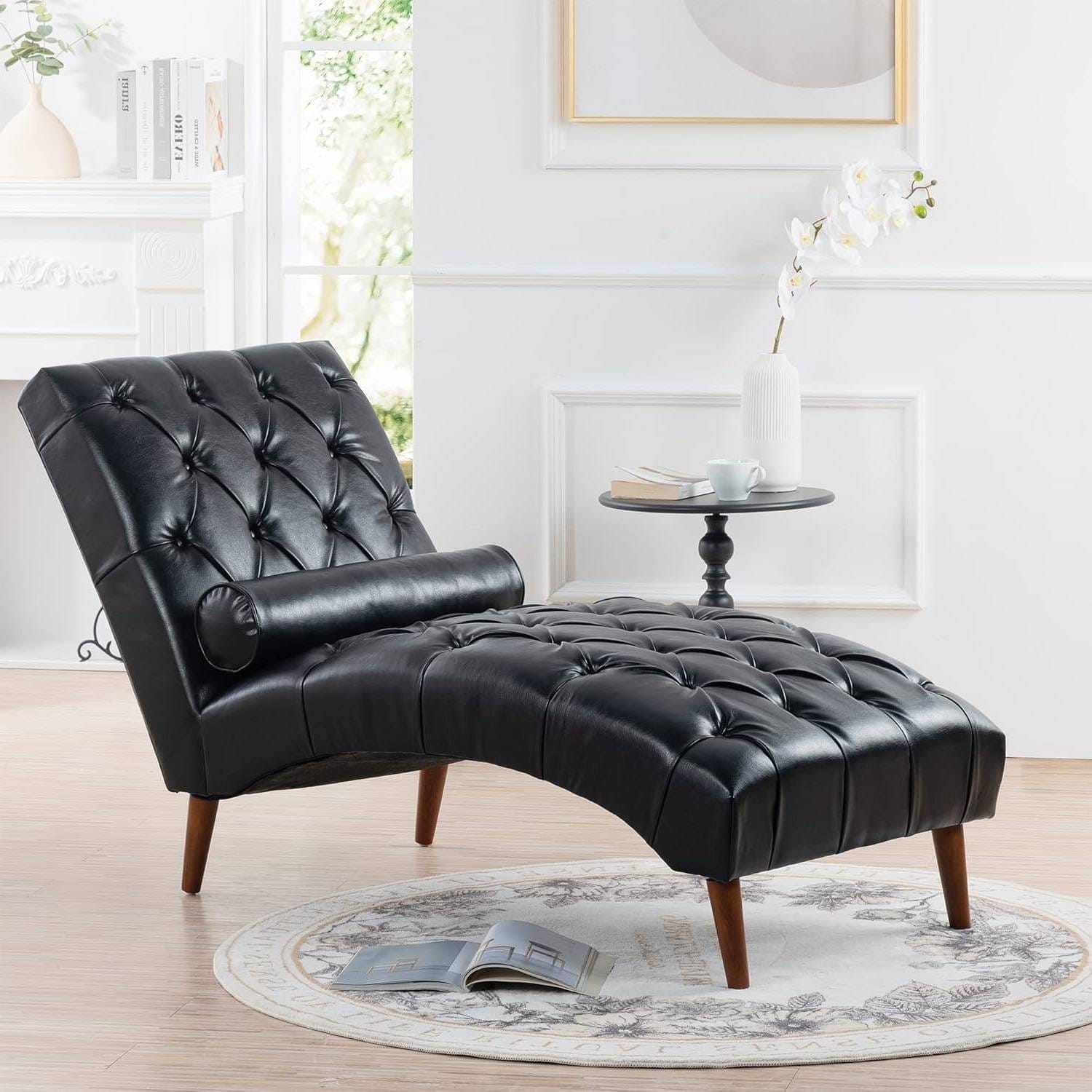 Black Faux Leather Upholstered Armless Chaise Lounge Chair with Lumbar Pillow