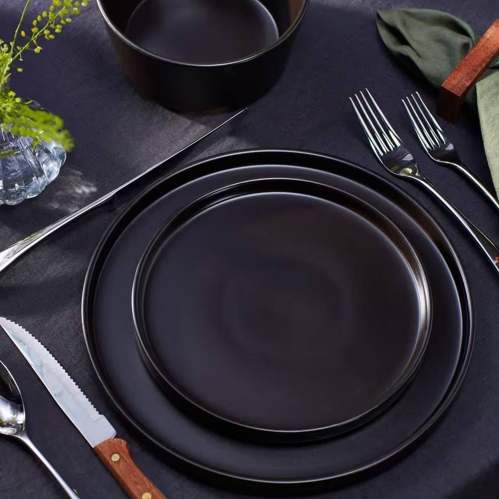 - Black Matte plates, bowls, mugs – 10.25” dinner plates, 7. 5” Salad plates, 5. 6.3” bowls and 12 oz. Mugs have a cool, hip, ebony design.