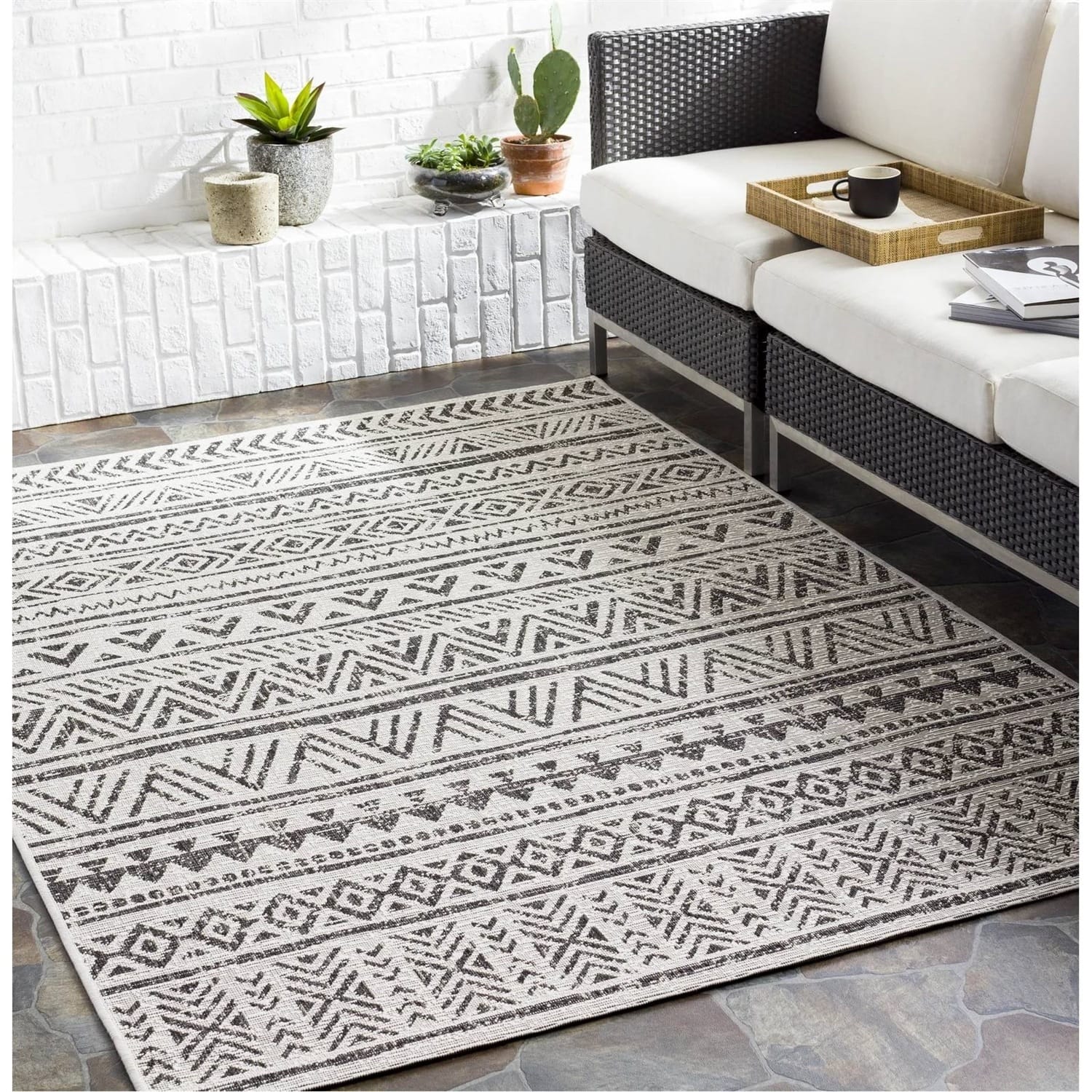 This 5 ft. x 8 ft. Black Off-White Chevron Coastal Boho Style Indoor Outdoor Area Rug grounds your indoor or outdoor space in a Moroccan-inspired print. It features rows of various geometric patterns in black and ivory hues, and it’s purposefully distressed for a vintage feel. This rug is power-loomed in Turkey from polypropylene, and it has a low 0.16″ pile height ideal for high-traffic areas like your patio, entryway, or living room. Best of all, it’s fade- and stain-resistant to stand up to regular use. To care for this rug, vacuum it without a beater bar and spot-clean it as needed.