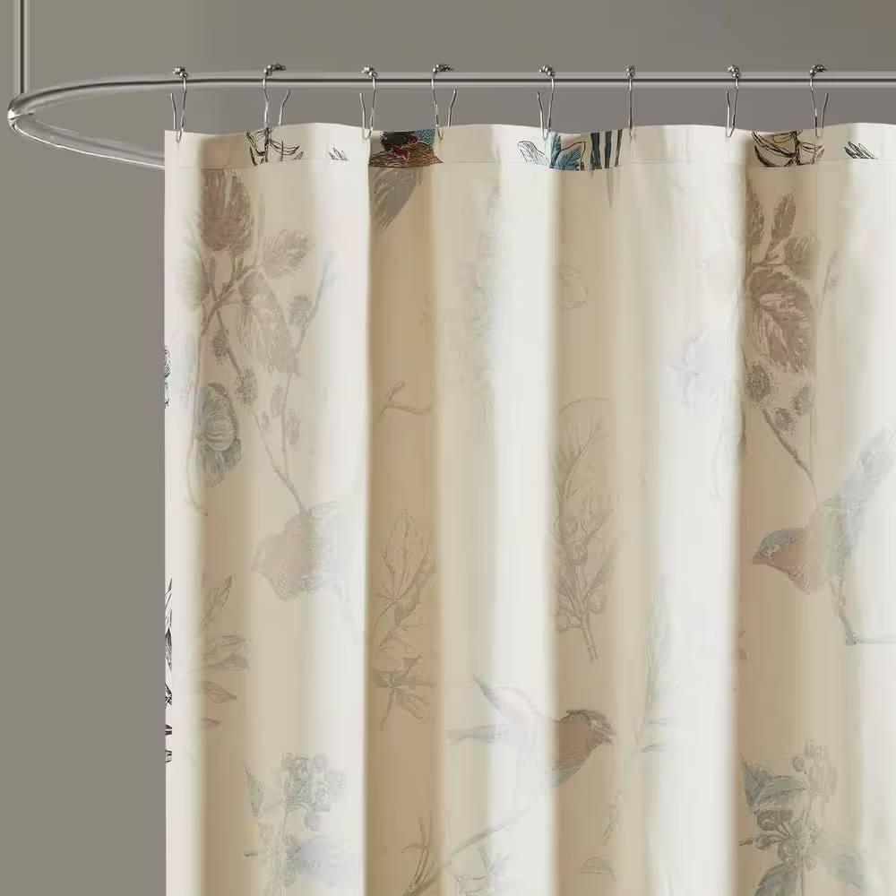 - 72-inch Beige Khaki Cotton Shower Curtain with Vintage Birds Leaf Floral Print