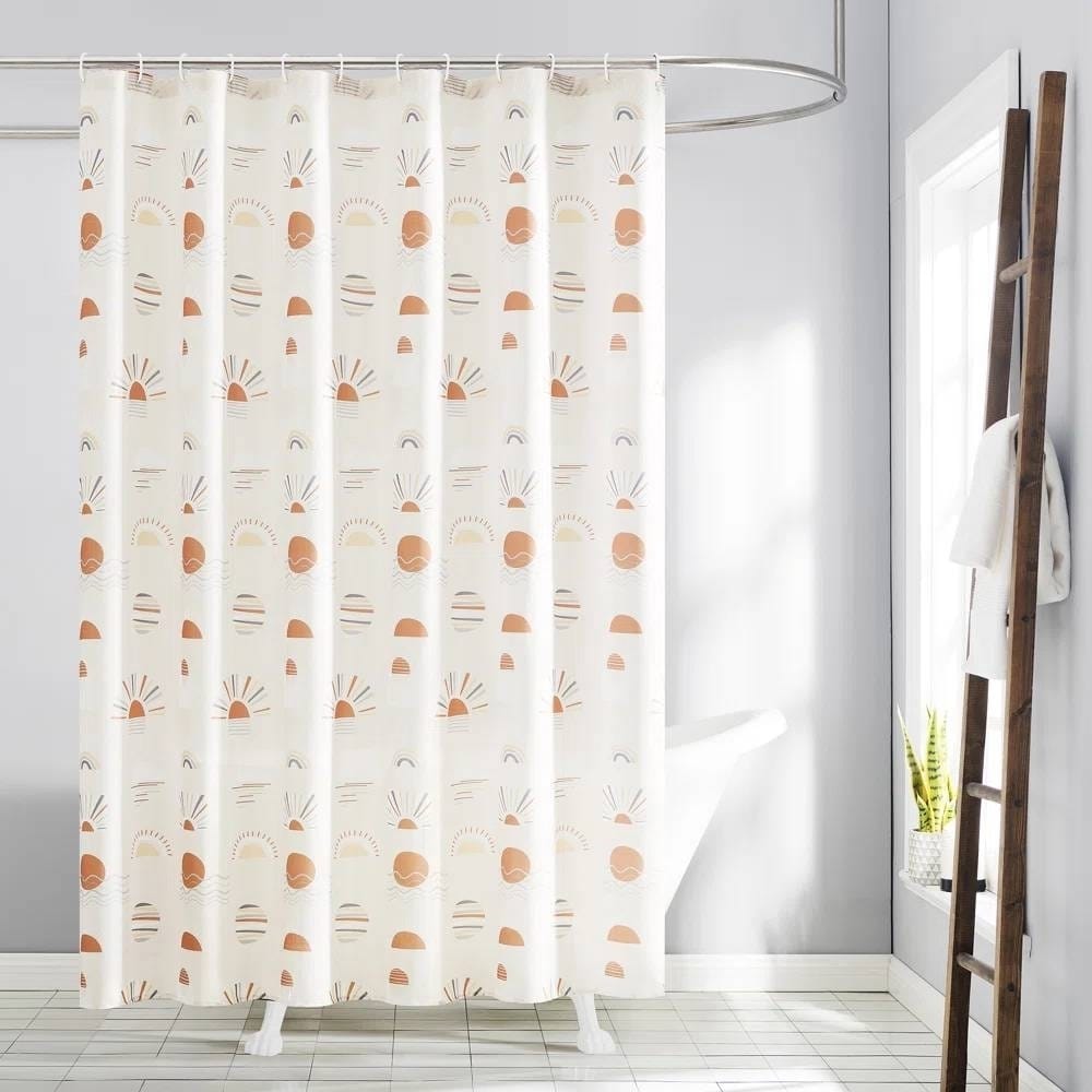 Breathe new life into your bathroom decor with the 72-inch Cream White Orange Sunset Bohemian Pattern Shower Curtain. Showcasing a boho inspired printed design, this 72-inch Cream White Orange Sunset Bohemian Pattern Shower Curtain is the complete solution to keeping floors free of splashing water. The buttonhole top design allows for easy ring installation and sturdy hanging. This set includes 1 printed shower curtain, 12 plastic rings for easy sliding, and 1 mini tote printed with the same design. The water-resistant mini tote is great for toiletries, shoes, the beach, shopping, or lunch on the go. Machine wash cold on gentle cycle. Use non-chlorine bleach when needed. Tumble dry on low heat, using a cool iron as needed.