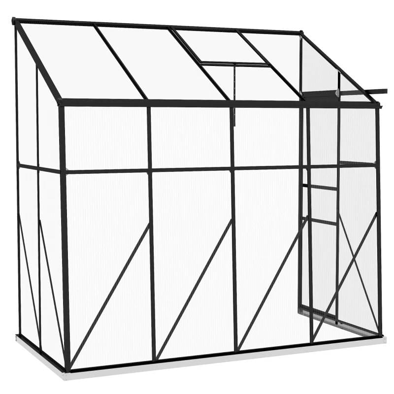 Want to grow better? Go with this 8.3 ft x 4.1 ft Outdoor Polycarbonate Lean-to Greenhouse with Black Metal Frame. Our spacious walk-in, lean-to greenhouse features twin-wall polycarbonate to protect plants from wind, cold, rain, UV scorching, and wild animals. Lean our greenhouse up to an existing structure such as your house, fence, shed, or garage. When you do, it will gain supplemental strength. A sliding door makes it convenient to enter, and there’s an adjustable vent on top; together, they give you greater control over humidity inside.