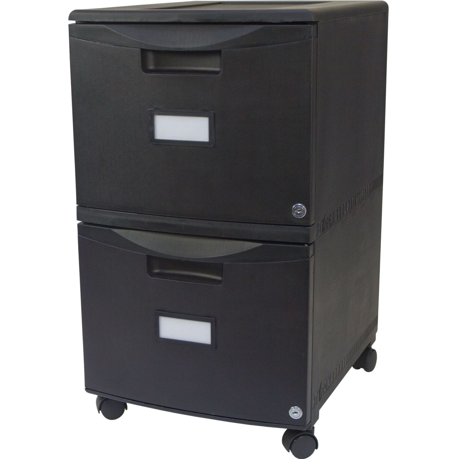 Stylish in both home and office, this Black 2-Drawer Locking Letter/Legal size File Cabinet with Casters/Wheels has 2 drawers that offer the option of storing either letter or legal hanging files. The lightweight poly construction includes 4 removable casters, making office re-organization quick and easy. Each drawer features a printable label as well as an independent key lock with key to keep contents secure.