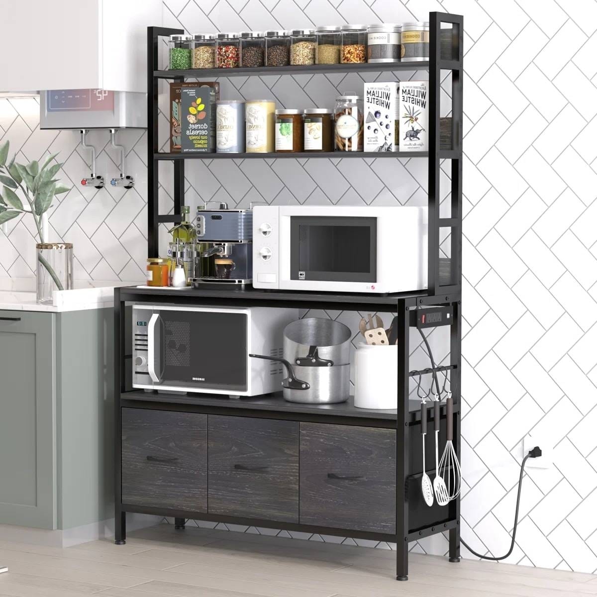 - The baker’s rack comes with 3 AC outlets, 2 USB ports, and a switch, A 6.56ft long power supply cord can allow you to plug in multiple appliances such as a microwave oven, coffee maker, and bread maker at the same time.