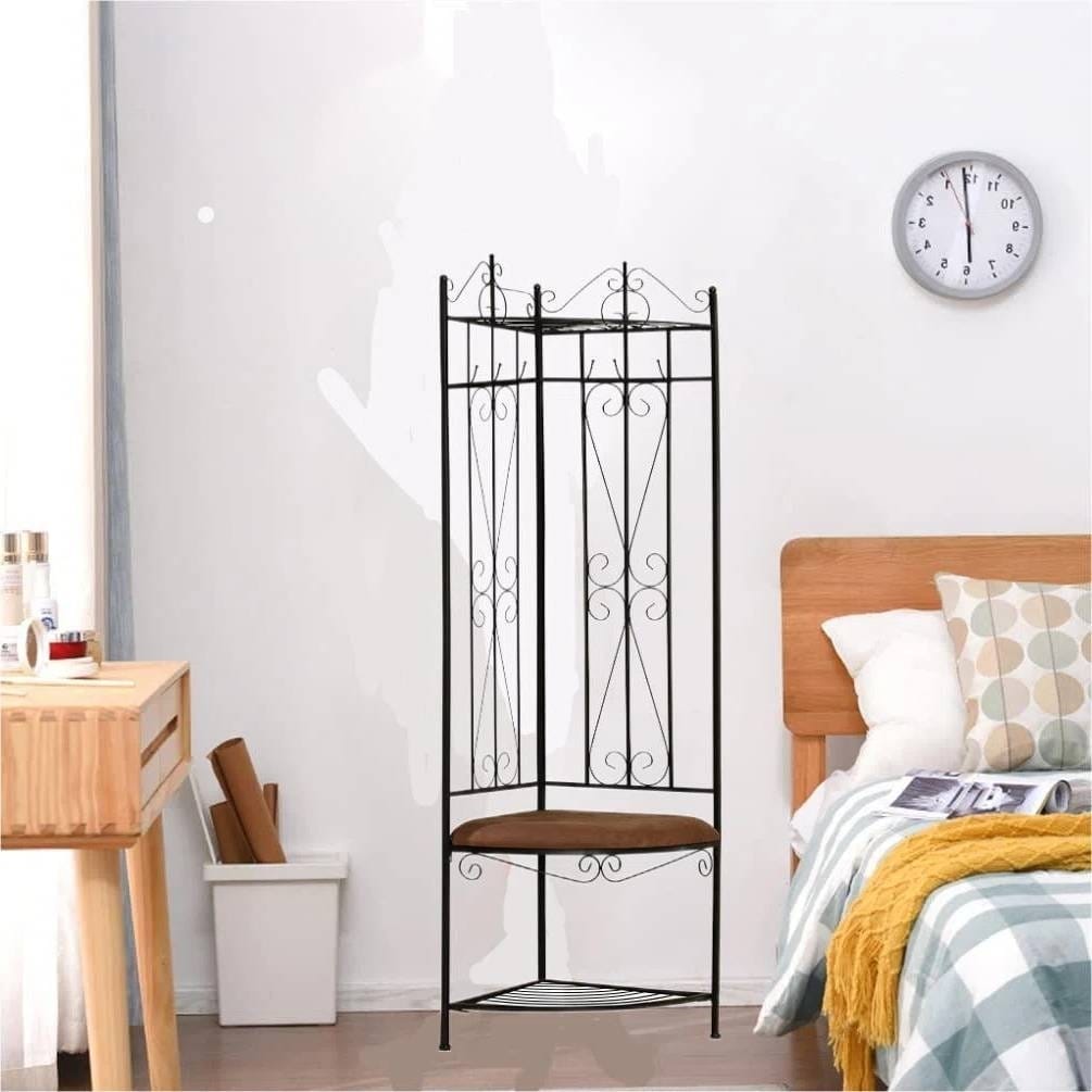 - Black Metal Scrolling Corner Hall Tree Coat Rack Storage Bench