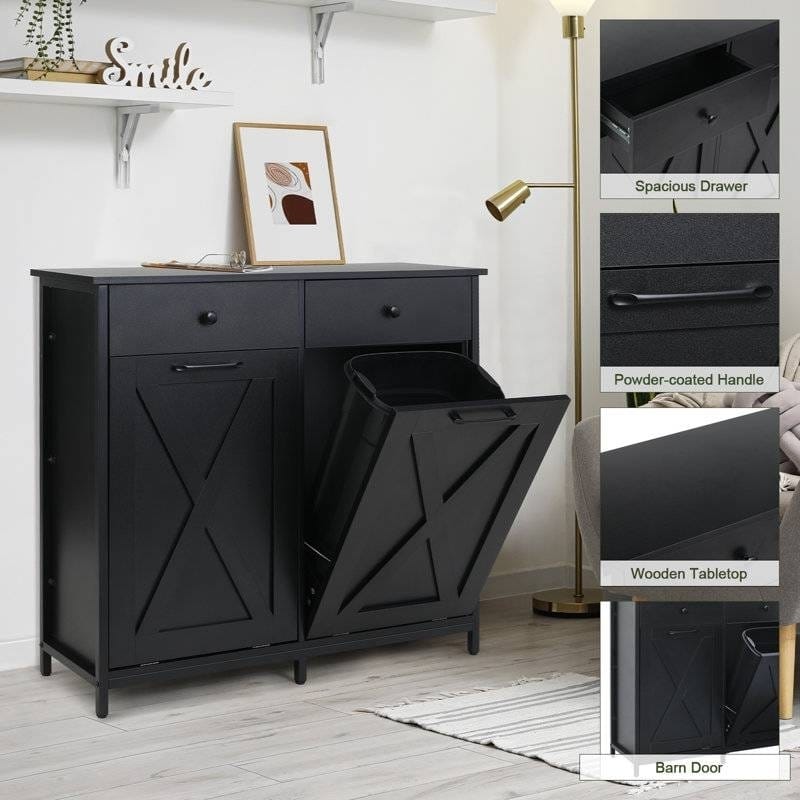 This Multipurpose 2 Drawer / 2 Tilt Out 10gL Kitchen Laundry Trash/Recycle Storage can be used anywhere! 2 drawers and a hidden bin door ensure a large storage capacity. Countertop can hold small appliances such as a coffee machine, and microwave oven, and drawers can be used to store cutlery, garbage bags, and other household items. Hide the dirty/messy garbage below in the tilt out trash cans (that fit 10 gallons trash can x 2)! The premium MDF material is covered with a high-quality finish that mimics the look of real wood grain, making the overall look of this trash bin cabinet natural and modern. Trash cans NOT included.