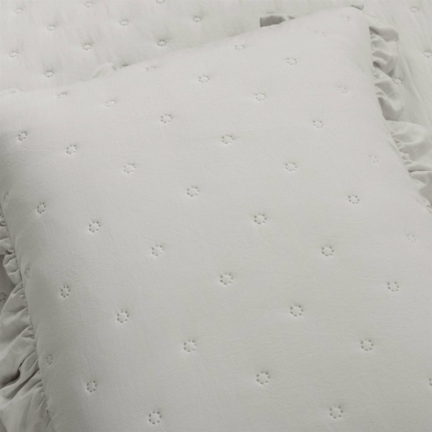 This Full/Queen Lightweight Grey Ruffle Reversible Oversized 3 Piece Quilt Set has cozy cottage style with a chic flair. Soft crinkled fabric and quilted tufting create an unmatched texture you’ll love to cozy up in. Airy ruffles edge the quilt and two matching shams, giving a feminine touch. The lightweight poly fill ensures all season comfort. Add this delightful Ruffle Reversible Oversized 3 Piece Quilt Set to your primary, guest, or teen’s bedroom to complete your charming personal style. The quilted detailing across the fabric adds dimension and extra comfort. You’ll love the ruffled edges that give this set extra pizazz. This Ruffle Reversible Oversized 3 Piece Quilt Set includes a soft and luxurious quilt and two matching pillow shams. The pillow shams also have the ruffled edges!