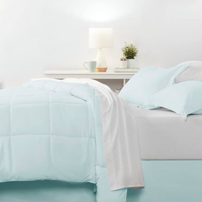 College dorm room approved! This complete comforter set includes everything needed for an easy update of any bedroom. The bed-in-a-bag includes 1 comforter, a white set of sheets, bed skirt, 2 shams, and 2 pillowcases. Each piece is made from microfiber/polyester that’s resistant to stains, wrinkles, mold, odors, fading, bed bugs, and dust mites. Classic baffle-box construction of the blanket keeps the filling evenly distributed. Machine washable, moisture-wicking, and non-pilling.