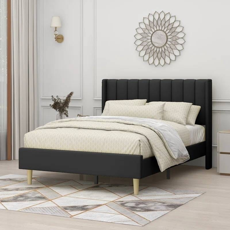 This Full size Mid-Century Black Linen Platform Bed Frame with Upholstered Headboard showcases a low-profile silhouette and clean lines for a mid-century modern look in your bedroom or guest room. The frame is built from engineered wood, and it rests on splayed legs with a light brown finish. This bed is upholstered in linen and/or velvet with a medley of colors to choose from that best suits your style. We love how the tall wingback headboard is padded with chic channel tufting, so you have a cushioned spot to relax for some late-night reading. Best of all, a box spring is not necessary. A mattress is not included. Note: The color might be affected by lighting conditions.