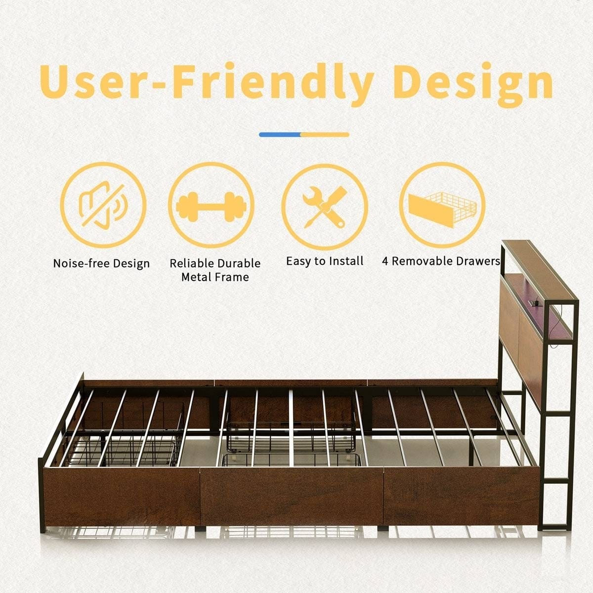 College Dorm ready!! This platform bed frame has a 2-tier storage headboard and storage drawers on wheels to greatly increase storage space. 2 AC outlets and 2 USB power strips built into the headboard are convenient for you to charge any Phone and/or iPad. In addition, its adjustable LED lights create various scenes with color-changing lighting. The wood grain of the bed adds character and warmth to any room.