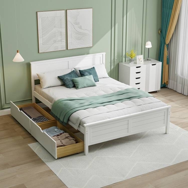 Get a coastal modern look with this Full Size White Platform Bed Frame with 2 Storage Drawers! 2 large slide-out drawers underneath offer extra space to store seasonal clothes and other belongings. With cut-out handles and smooth wheels, the drawers are easy to pull in or out. Even better, the drawers can be used on both sides of the bed. The bed frame is constructed of 8 sturdy wooden slats with tight screw connection to support the mattress, and its load capacity reaches 352 lbs. Fitted with additional support legs, the platform bed frame is more stable without squeaking.