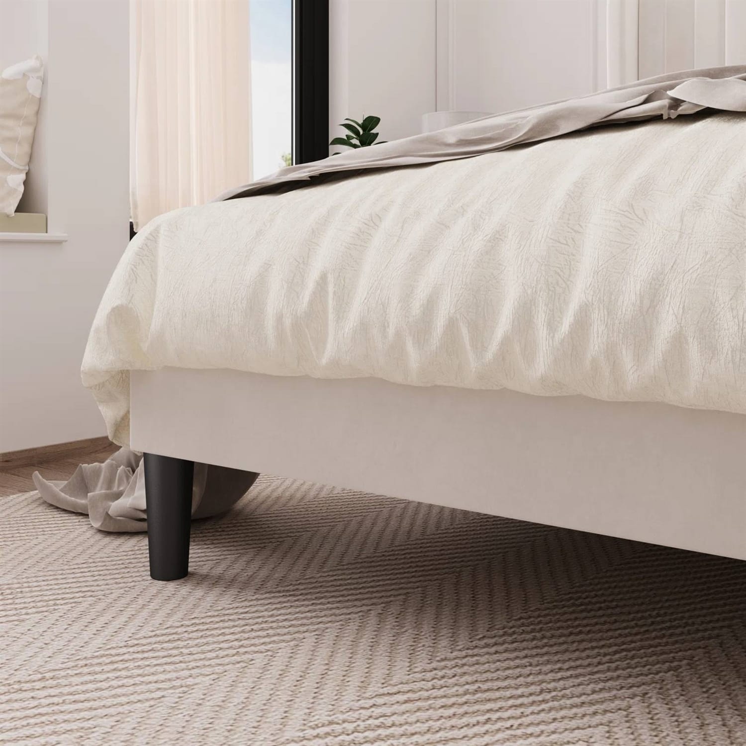 This Full size White Velvet Upholstered Platform Bed Frame with Wingback Headboard is designed with simple lines to create the peaceful, warm feel you want in your bedroom. You can freely create the bedroom style you want. It also has a wingback headboard, which adds visual interest to the overall simple yet grand style without being too crowded. This bed has sturdy wooden slats and a center support leg to increase stability, and it does not require a box spring. With it, you can enjoy a luxurious sleep.