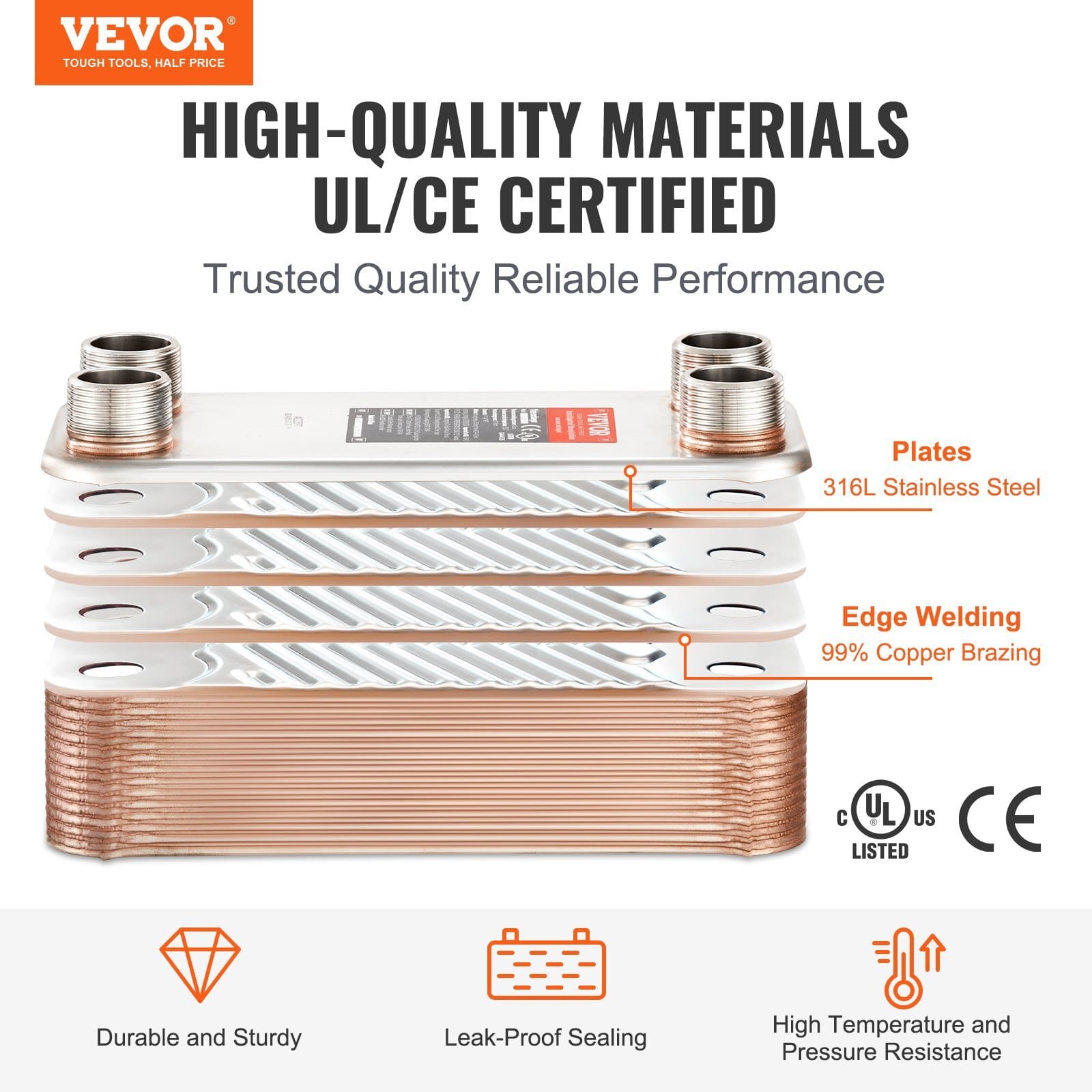Plate Area: 5×12 inch/ 127x305mm,Heat Capacity: 260-360K BTU,Port:4*1-1/4″ MNPT External Thread,Color: Stainless Steel + CopperColor,Model: EATB28-30,Thermal Efficiency: 90~99%,Material: 304/316Stainless Steel, Solder: 99.9% Copper Brazing,Plates Quantity(pcs):30,Product Dimensions (L x W x H): 11.85×4.96×4.33″ / 301x126x110mm,Net Weight (with Accessories): 12.9lb / 5.85kg