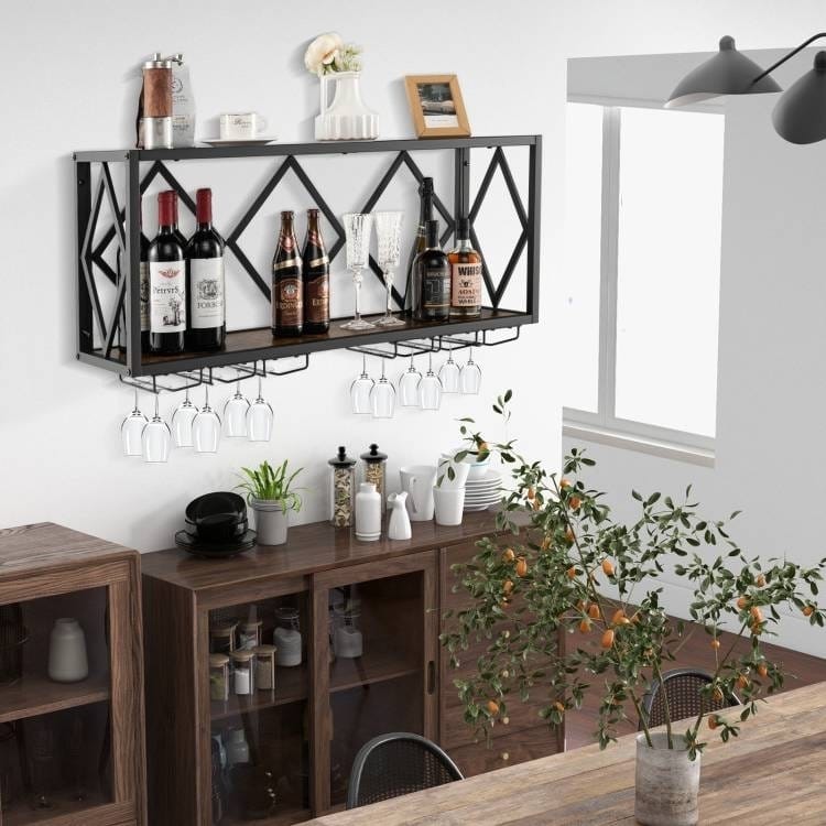 This XL Large Industrial Rustic Brown Wall Mounted Wine Rack holds up to 39 bottles and 12 glasses! Comes with 4 expansion bolts and 1 hexagon wrench help you to firmly fix this wine rack into the wall. Then, our large wall wine rack will provide extra storage space, which won’t take up the floor space and is ideal for any narrow space. Anti-falling design on both sides of the wine rack protects wine bottles from falling, improving overall security to a higher level. Besides, you can quickly and effortlessly wipe the smooth surface clean.