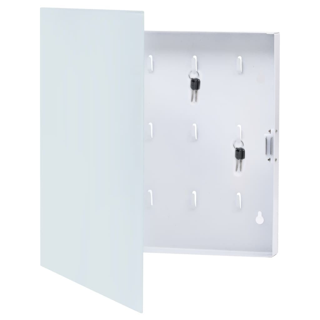 The key cabinet is made of strong powder-coated steel with 12 hooks in the cabinet, providing ample storage space for your keys. The magnetic front door is made of tempered glass and ideal for sticking notes, photos and other important items. Paper items are also held firmly in place on the cabinet front using one of the 6 magnets. Additionally, you can even write on the magnetic board with the pen. It is easy to clean with the included board wiper.