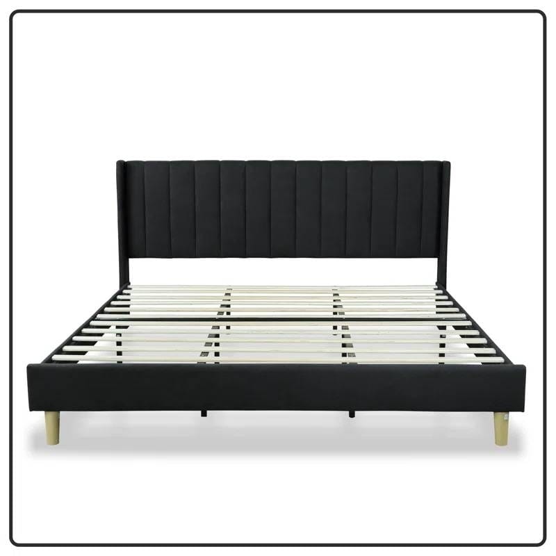 This King size Mid-Century Black Linen Platform Bed Frame with Upholstered Headboard showcases a low-profile silhouette and clean lines for a mid-century modern look in your bedroom or guest room. The frame is built from engineered wood, and it rests on splayed legs with a light brown finish. This bed is upholstered in linen and/or velvet with a medley of colors to choose from that best suits your style. We love how the tall wingback headboard is padded with chic channel tufting, so you have a cushioned spot to relax for some late-night reading. Best of all, a box spring is not necessary. A mattress is not included. Note: The color might be affected by lighting conditions.