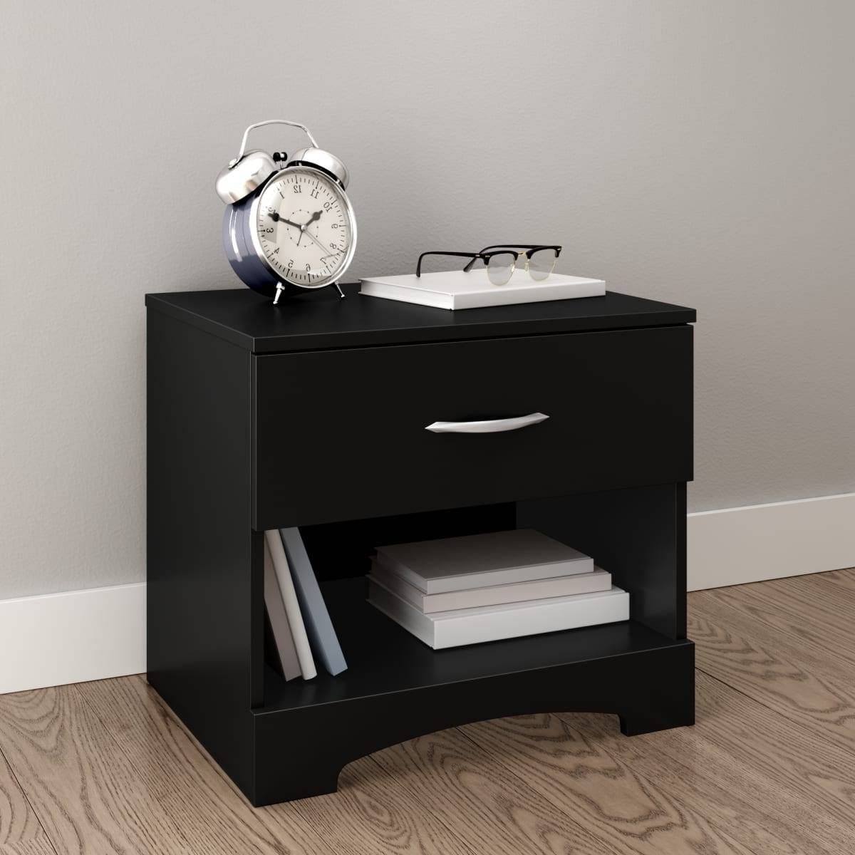 Need modern storage space? No problem!! This clean nightstand offers clean lines and a modern look that will complement any bedroom dcor. Convenient Storage Featuring an open easy-access storage space ideal for bedside reading materials, the nightstand also includes a convenient and practical drawer with smooth metal drawer slides and a durable metal handle. This product is made in North America with Laminated particleboard. Accessories not included.