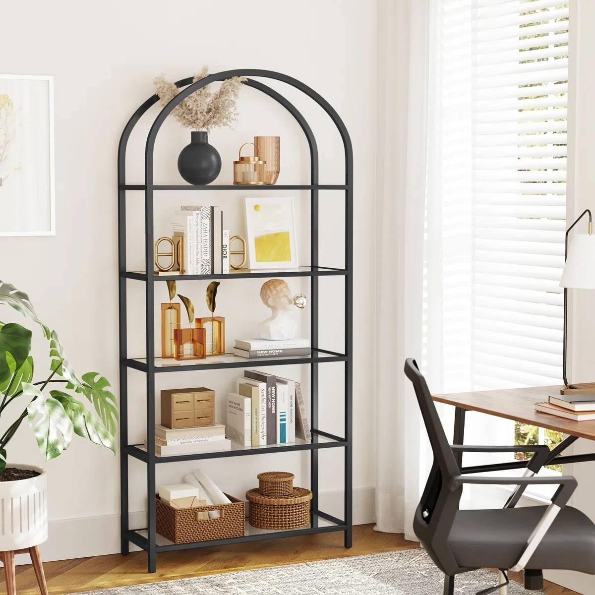 - Modern Black Metal Arched Top Display Rack Bookcase with 5 Glass Storage Shelves