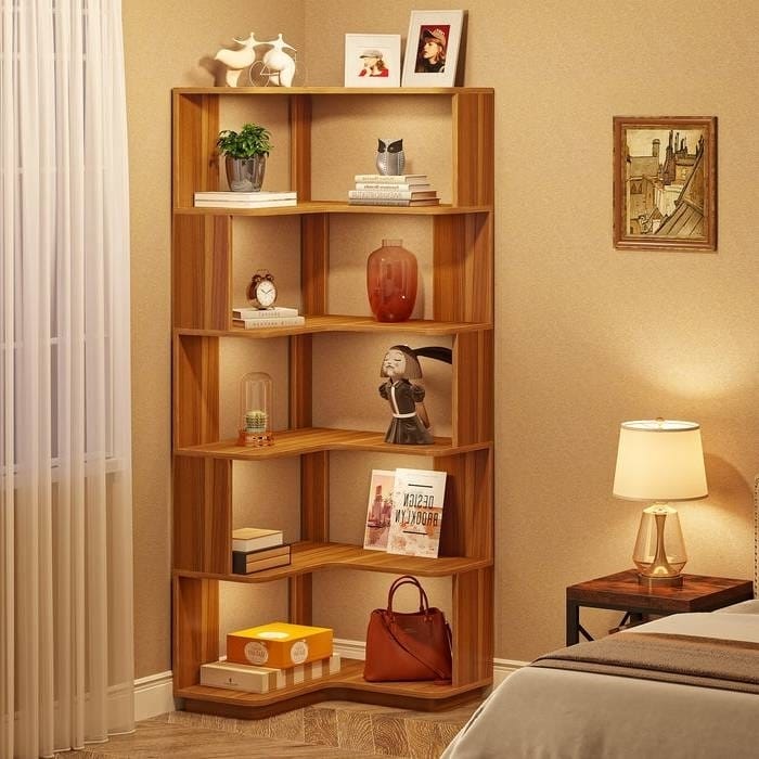 This Multifunctional Wooden Grain 6 Shelf Corner L Bookcase Organizer efficiently uses corner spaces, freeing up floor space, and adding style to your interior. With its 90° right-angle, industrial wood-grain shelves, this six-tier storage shelf offers a neat display space for books, photos, plants, and more, making your room tidier. Made of wood-grain particleboard, each shelf can hold up to 60 lbs. This free-standing storage rack, perfect as a bookshelf or display shelf, is a great addition to living rooms, bedrooms, hallways, offices, etc. Comes with side panels to enhance the shelf’s stability and prevent items from falling, ensuring safer and cleaner storage. Dimensions: 23.62″L x 23.62″ W x 64.96″H.