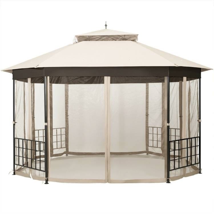 - Outdoor 10 x 12 Ft Octagon Gazebo with Mosquito Net Sidewalls and Beige Canopy