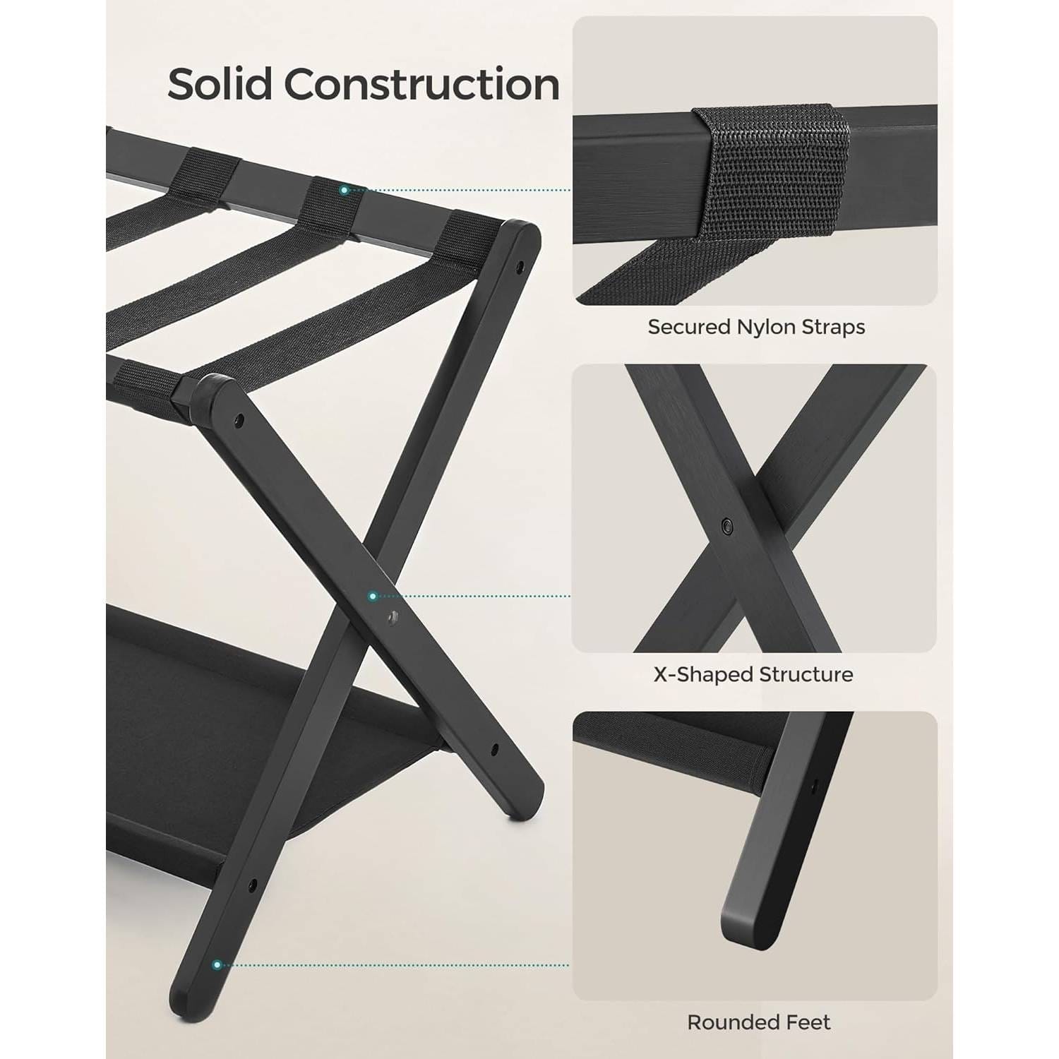 - Sturdy Bamboo Luggage Rack in Black Wood Finish with Lower Storage Shelf