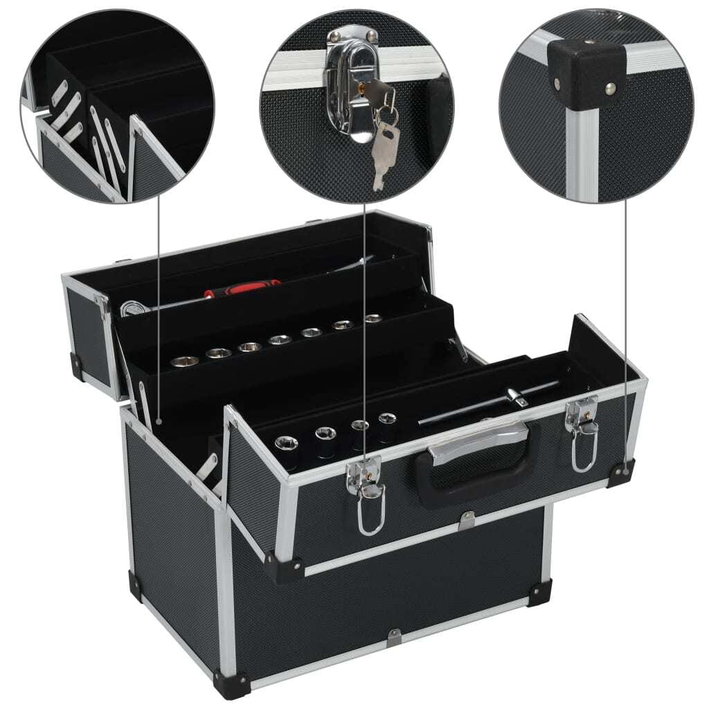 Made of wood, ABS sheeting and aluminum, this tool case is water proof and long lasting. It comes with the reinforced aluminum trimming for added strength. This tool case features an extendable top and 6 trays, providing ample storage space to keep your tools, such as screwdrivers, pliers and spanners well organized. It is lockable with 2 keys included. Additionally, it features a carrying handle which enables you to easily take along everywhere you go!